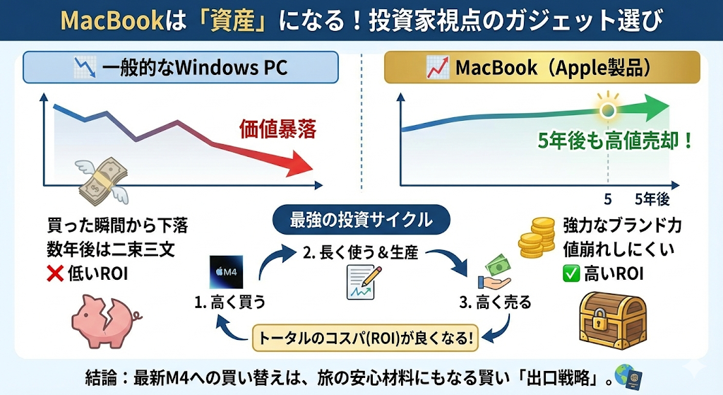 このサイクルを作れるのがApple製品の強みです。 中途半端に古いモデルを買うより、最新のM4を買って長く使った方が、将来売る時の価格も高くなるため、トータルのコストパフォーマンス(ROI)は良くなります。