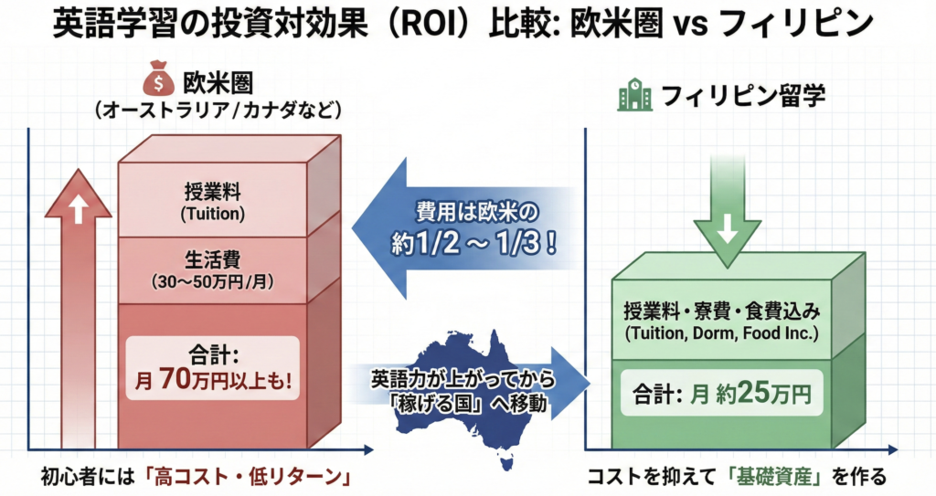 皆さんもご存知の通り、オーストラリアやカナダなどの欧米圏は、学費も生活費も非常に高いです。 英語がまだ話せない状態で高い生活費を払いながら語学学校に通うのは、投資家目線で見ると「高コスト・低リターン」な期間になりがちです。